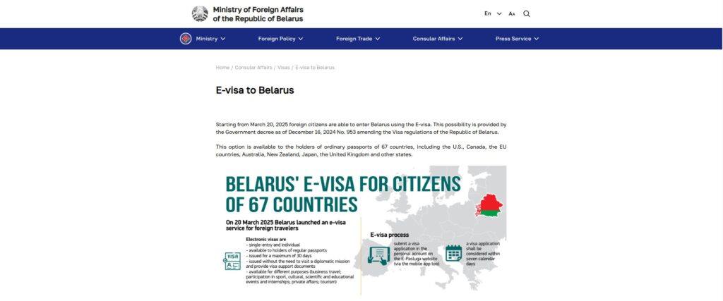 UncategorizedMinistry of Foreign Affairs of the Republic of Belarus Source: https://mfa.gov.by/belarus/visa/general/evisa/ © When using the site materials reference to the source is required. mfagovbybelarush@gmail.com / December 9, 2025